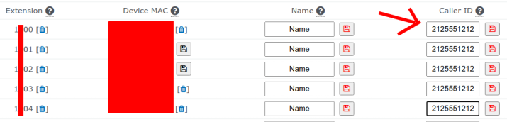 - Locate the Caller ID column for each extension/device you would like to update.