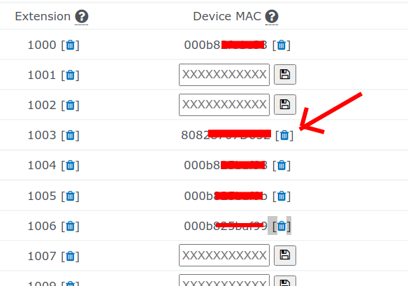 - Locate the extension number from the EXTENSION column or the MAC address of the phone from the DEVICE MAC column. Next to the device MAC there is a trash can icon. If you would like to de-activate a phone click the TRASH CAN icon.