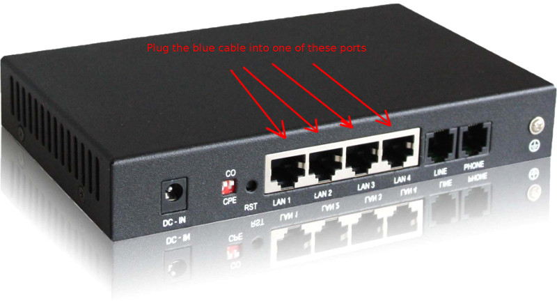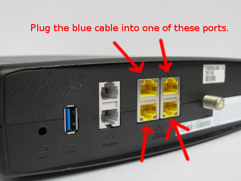- Connect one end of the blue cable to the modem supplied by your ISP. See images below for common configurations. Clicking the images below to magnify them for easier viewing.