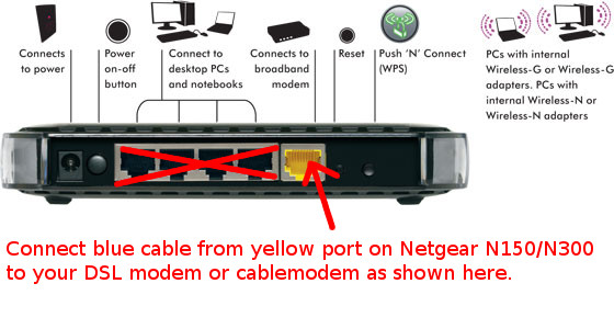 - Connect the other end of the blue cable to the YELLOW port on your Netgear router.