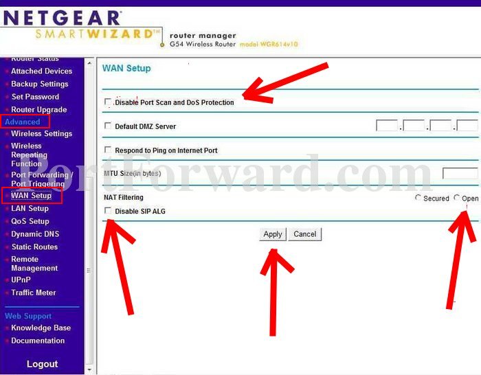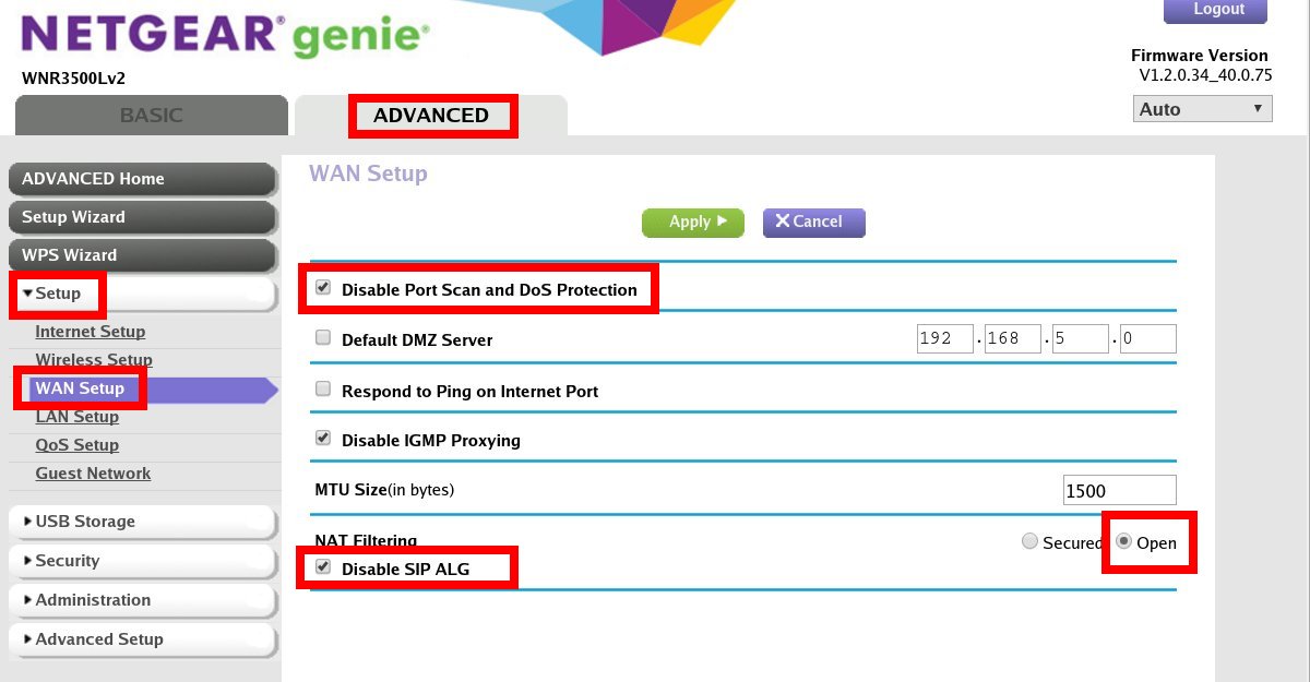 Check the box for DISABLE PORT SCAN AND DOS PROTECTION.